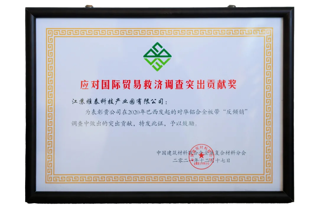 2021年,受各種不可抗力因素影響,國際市場貿(mào)易摩擦不斷,雅泰外貿(mào)形勢略為嚴峻,但雅泰通過強大的國家背書,尋求各方支持幫助、積極應(yīng)對,成功打贏反傾銷一案,大會特別頒發(fā) “應(yīng)對國際貿(mào)易救濟調(diào)查突出貢獻獎” 。