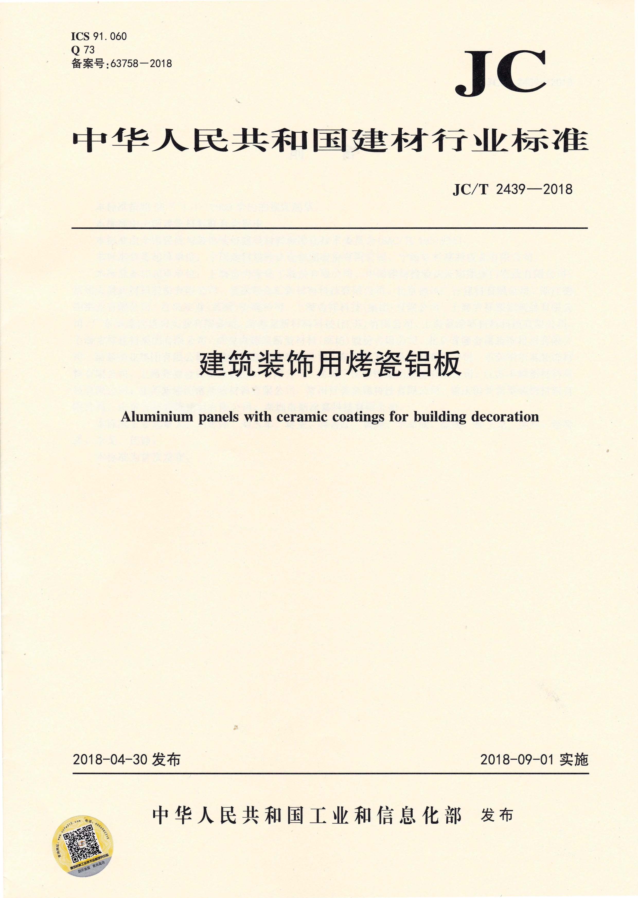 近日,由中國(guó)建筑材料聯(lián)合會(huì)提出,雅泰實(shí)業(yè)集團(tuán)有限公司參與起草的JC/T 2439-2018《建筑裝飾用烤瓷鋁板》、JC/T 2438-2018《建筑裝飾用單涂層氟碳鋁板(帶)》兩項(xiàng)行業(yè)標(biāo)準(zhǔn)于2018年4月30日首次發(fā)布,2018年9月1日起正式實(shí)施。